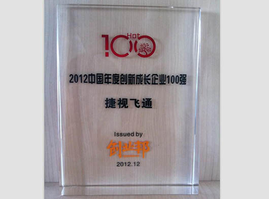 由創(chuàng)業(yè)邦傳媒組織評(píng)選的“創(chuàng)業(yè)邦100”中國年度創(chuàng)新成長企業(yè)評(píng)選活動(dòng),歷時(shí)3個(gè)月,參選企業(yè)達(dá)5000余家。捷視飛通在創(chuàng)新性和成長性等方面的優(yōu)勢(shì)明顯,成功入選2012“創(chuàng)業(yè)邦100”-中國年度創(chuàng)新成長企業(yè)100強(qiáng)。